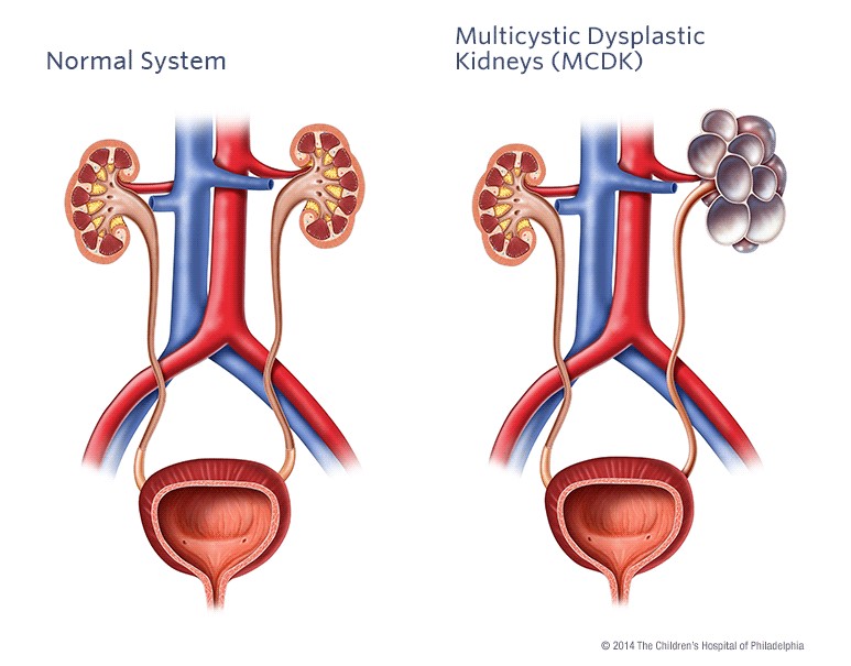 کلیه دیسپلاستیک مولتی کیستیک(multicystic dysplastic kidney) ( در این حالت کلیه فاقد عملکرد بوده و به صورت مجموعه ای از کیستها، با سایز متفاوت میباشد. این ناهنجاری مادرزادی تقریبأ همیشه یکطرفه بوده و موارد دوطرفه با حیات مغایرت دارد. )، 6-4%